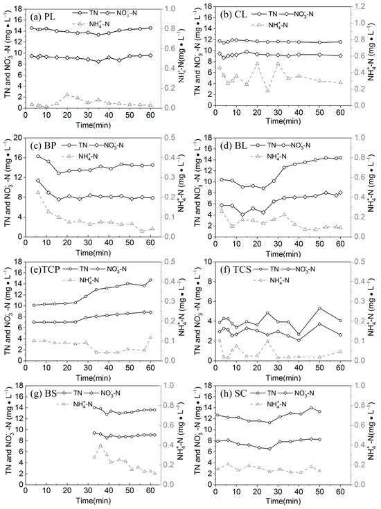 The variation of the TN, –N and –N on different slopes are shown in Figure 5. TN concentrations on all eight slopes generally increase with an increase in the runoff duration, but with different extents. The TN concentrations of TCP and BL increased from 10.11 mg/L and 10.41 mg/L at the early stage of runoff to 14.69 mg/L and 14.38 mg/L at the end of runoff, respectively. Different slopes had different initial runoff TN concentrations and different concentration increments, indicating that the runoff conditions on different slopes had different effects on the analysis of soil nutrients. BP had the highest average runoff TN concentration of 14.23 mg/L, whereas TCS had the lowest concentration of 3.99 mg/L. The BP runoff flowed easily across BL, promoting a quick analysis of soil nutrients, whereas the peanut coverage on the lower part of the slope prolonged the runoff lag time, allowing soil nitrogen to dissolve into the runoff and leading to an increased TN concentration for BP.