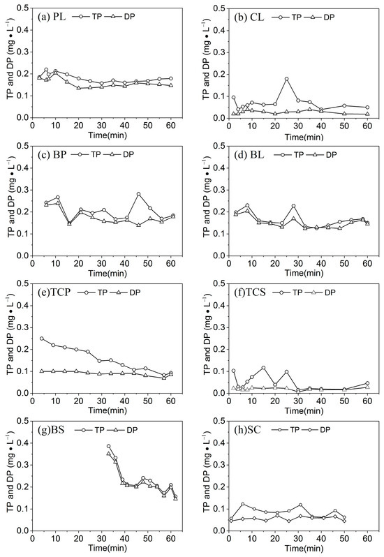 The variation patterns of TP and DP concentrations in runoff on different slope types are depicted in Figure 6. The TP concentrations on all slopes exhibited an overall fluctuating and decreasing trend, with some localized peak concentrations. The TP concentrations on CL, BP, BL, TCP, TCS, and BS decreased from 0.09 mg/L, 0.25 mg/L, 0.20 mg/L, 0.25 mg/L, 0.10 mg/L, and 0.38 mg/L at the early stage of runoff to 0.05 mg/L, 0.18 mg/L, 0.15 mg/L, 0.09 mg/L, 0.05 mg/L, and 0.16 mg/L at the end of runoff, respectively, showing phosphorus loss with runoff is a process of reduction. Different crop covers and tillage measures resulted in different initial TP concentrations. Total phosphorous (TP) concentrations in PL and SC increased from 14.55 mg/L and 12.66 mg/L at the early stage of runoff to 14.56 mg/L and 13.29 mg/L at the end of runoff, with a 0.01 mg/L and 0.63 mg/L increment, respectively. Different levels of runoff on different slopes led to different TP concentrations. The PL had the highest TP concentration in runoff.