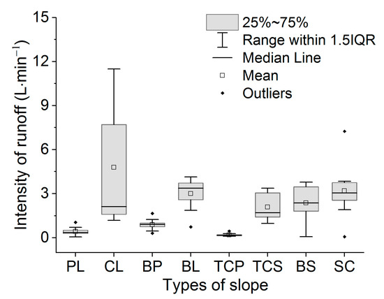 The average runoff intensity followed the order TCP < PL < BP < TC < BS < SC < BL < CL (Figure 7). TCP had the smallest runoff intensity of 0.2 L/min. Due to the strong fluctuation at the early stage and the end of runoff, the runoff intensity of CL was greater than BL at 4.78 L/min. From the position of the beard, the runoff of CL was shown to have the largest fluctuation range, whereas those of TCP exhibited the smallest fluctuation range.