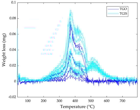 3.1. Sample Weight Loss in Simultaneous Thermal Analysis (STA)