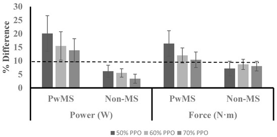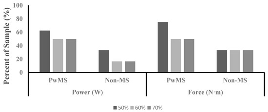 Previous investigations examining asymmetries in muscle function have utilized percent differences between contralateral limbs in outcome measures to evaluate the presence of asymmetry. A percent difference between contralateral limbs in muscle function that is ≥10% has been previously defined to indicate the presence of asymmetry [14,24,25]. Although a statistically significant difference in asymmetry between groups was not present in the current study, the group average for the PwMS group exhibited asymmetry values ≥10% for power and force at 50%, 60%, and 70% of PPO (Figure 1). The group average for the Non-MS group did not exhibit asymmetry levels that exceeded 10% for either power or force at any of the measured exercise intensities. Additionally, PwMS had a higher percentage of the sample that reached the ≥10% threshold for both variables at all three exercise intensities compared to the Non-MS group (Figure 4). The levels of asymmetry in power and force production observed in the current study are similar to those previously reported for power production during unilateral cycling in PwMS (10–28%) [11]. It has been argued previously that statistical analysis in nonhomogeneous clinical populations may mask clinically relevant differences, and an alternative analysis may provide additional insight [31]. Assessing asymmetry based on a defined threshold may provide better insight than traditional analysis when observing persons with MS. Future research is needed to determine a clinically meaningful level of asymmetry in order to provide guidance for future analysis.