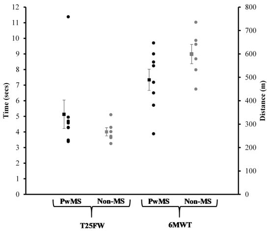 Walking Capacity: Both the T25FW and 6MWT are assessment tools utilized by both researchers and clinicians to evaluate disease progression and walking capacity in PwMS [21,22]. The T25FW requires participants to begin in a standing position and walk 25 feet as quickly as possible, but safely [21]. The participants were instructed to walk back to the starting point, and the test was performed again. The dependent variable was the average amount of time (seconds) required to walk 25 feet over the two trials [21]. The 6MWT was conducted on a 60-m marked course, and participants were instructed to cover as much ground as possible in 6 min while walking [22]. The total distance covered was recorded to the nearest meter [22].