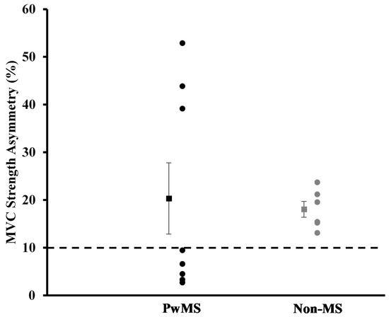 Maximal voluntary isometric contractions (MVC) strength asymmetry score. Data are presented as mean ± SE. Dotted line indicates 10% threshold for asymmetry.