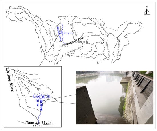 The experimental water was sampled from the Jinjiang River, and the sampling site was located in Guojiaqiao, Wuhou District, Chengdu, as shown in Figure 2. Natural water was used in the experiment, and the characteristics of the pollutants and microbial species in the original river were considered to reflect the degradation trend of organic matter under natural conditions. The sampled Jinjiang River water was drained into the annular flume and the static tank, and the temperature was controlled at 20 °C in the constant-temperature laboratory.