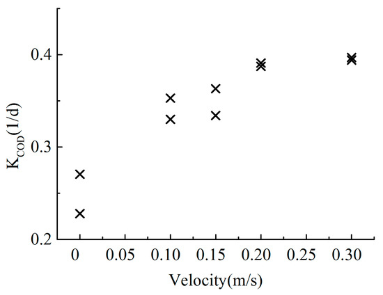 The COD degradation process followed a first-order kinetic equation, and the fitted degradation coefficient was corrected according to the temperature correction coefficient. The obtained COD degradation coefficients are shown in Table 2. The COD degradation coefficients increase with increasing flow velocity, and the relationship between the COD degradation coefficient and the flow velocity is shown in Figure 4. As the flow velocity was 0.001 m/s, the COD degradation coefficients varied from 0.228 1/d–0.271 1/d. When the flow velocity increased to 0.30 m/s, the COD degradation coefficients ranged from 0.394 1/d–0.397 1/d. As the flow rate continued to increase, the effect of the flow rate on the COD decay rate diminished, which suggests a decrease in the microbiological response. Due to experimental flow rate limitations, no experiments with high flow conditions were performed.