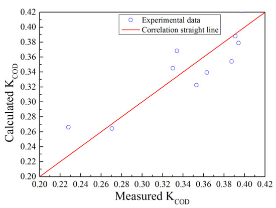To obtain the relationship between the degradation coefficient and hydraulic conditions, 10 scenarios were investigated. The experimental parameters are shown in Table 3. A regression analysis was employed to analyze the data in Table 3. The optimal values of a, b and c were 0.8415, −1.2719 and 0.258, respectively, and the correlation coefficient of the regression equation was 0.78 (see Figure 5). By substituting the values into Equation (12), the formula for the COD degradation coefficient can be expressed as follows: