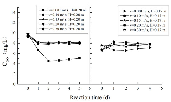 DO is one of the most important variables that affects water quality. Low concentrations of DO may directly affect the water quality and disrupt a healthy ecological balance [22]. Hydraulic conditions have a significant impact on dispersion and reaeration within a river [23]. When the flow velocity is 0.001 m/s, the exchange of oxygen between air and water is weak, resulting in a poor reaeration effect in the water body. For slightly faster flowing water, the exchange of oxygen between water and air is accelerated due to the role of turbulence, which leads to a high level DO concentration in water. In the hydrodynamic scenarios (other than u = 0.001 m/s), there was no obvious difference in the DO concentration, and all values remained at approximately 8 mg/L. The variation of the DO concentration in different scenarios is shown in Figure 6.