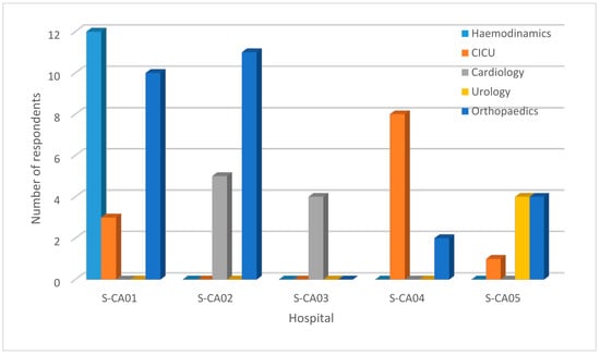 The data were collected between March and April 2019. The wall-targeted population, that is, all workers involved in X-ray-guided procedures, involved 82 operators. Of these, 18 workers refused to participate in the interview. Therefore, 64 questionnaires were completed. The respondents included 21 physicians, 26 MRTs, and 17 nurses. The distribution of the respondents according to their professional categories is shown in Table 3. The number of respondents from each hospital and department is represented in Figure 1.