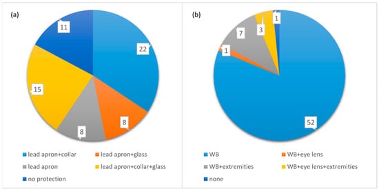 From the analyses of the second part of the questionnaire, 53 interviewed workers reported using body radiation protection shields (0.5 mm lead). Among these, 8 workers affirmed to use only body radiation protection shields, 22 workers wore the protective thyroid collar at the same time, 8 workers wore also X-ray-shielding glass, and 15 used both protective thyroid collar and X-ray-shielding glass. Finally, 11 workers (4 physicians, 2 MRTs, and 5 nurses) declared not using any protective device. No worker reported using a lead cap or anti-x mask. All the 53 respondents using at least one type of IPD reported wearing it routinely in their clinical practice.