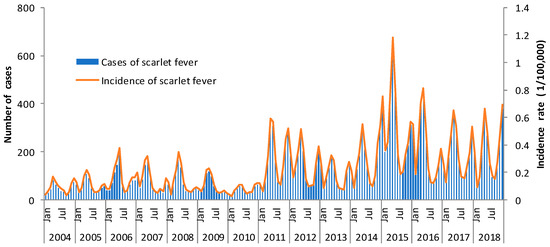 Monthly incidence and reported cases of scarlet fever in Zhejiang Province in 2004–2018.