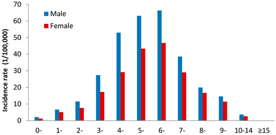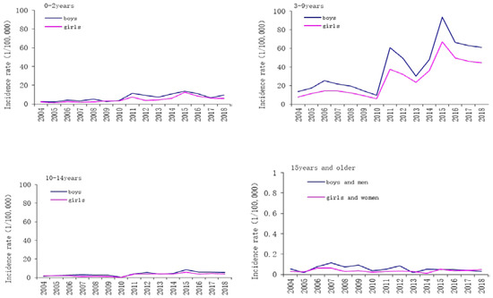 In 2004–2018, a total of 13,715 male cases and 8479 female cases of scarlet fever were reported, with a male to female ratio of 1.62:1 (Table 1). Overall, we found that the incidence rates gradually decreased with the increasing age (χ2trend = 130,082.8, p < 0.05), and adult incidence rate of was very low (Figure 2). The average annual male incidence was 3.39/100,000, and the average annual female incidence was 2.20/100,000. The incidence of male was higher than that of female (χ2 = 999.834, p < 0.05). In terms of occupational distribution, the cases were mainly kindergarten children (43.09%, 9563), followed by students (35.57%, 7894). In terms of age of onset, most scarlet fever cases were 3–9 years old (86.42%, 19,179) during the study period (Table 1). The annual incidence among patients aged 0–2 years peaked in 2011 and 2015, and the annual incidence among those aged 10–14 years peaked in 2012 and 2015, whereas the incidence among those aged 3–9 years peaked at three timepoints, in 2006, 2011, and 2015 (Figure 3). On the contrary, the annual incidence among cases aged ≥15 years remained substantially lower than the other age groups (Figure 3).