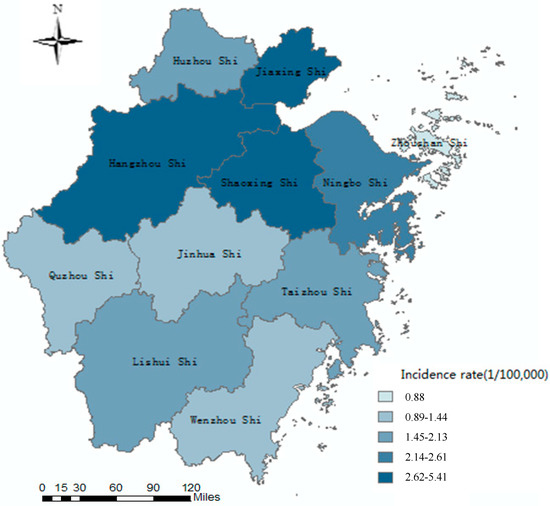 In 2004–2018, scarlet fever cases were reported in 11 cities throughout the whole province, with the highest reported incidence in Shaoxing (5.41/100,000), Hangzhou (5.39/100,000), Jiaxing (4.38/100,000), Ningbo (2.61/100,000), and Huzhou (2.12/100,000). The top five cities reported cases were in Hangzhou (6341 cases), Shaoxing (3703 cases), Ningbo (2687 cases), Jiaxing (2637 cases), and Taizhou (1843 cases) (Figure 4).
