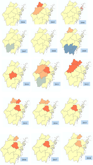Clusters of scarlet fever incidence in Zhejiang Province, 2004–2018.