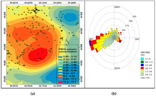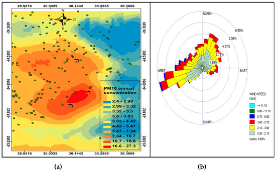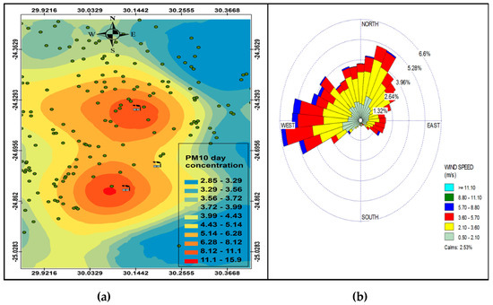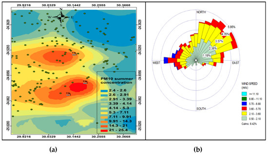Figure 9a,b), the north north-easterly to easterly winds are the dominant winds responsible for the dispersion of pollutants to the west and south-west of the facilities in the area. The south-westerly and north-easterly flows are parallel to the valley axis, particularly near Smelter 1 and Smelter 2. There is little or no wind coming from the southerly sector during all seasons. This could be due to the orientation of the valley axis in a south-westerly and north-easterly direction in the south of the study area and the north-west and south-east in the north of the study area. The lack of winds from the south limits the transport of pollution to the north of the facilities in the area. The seasonal patterns on the PM