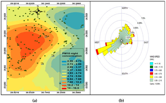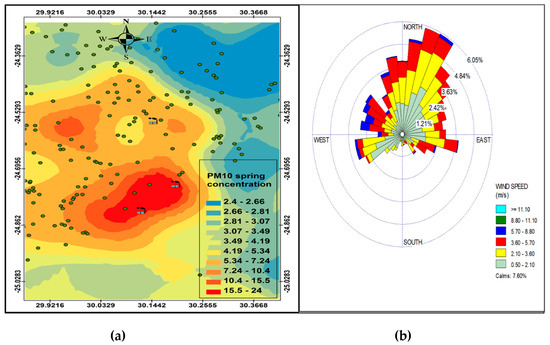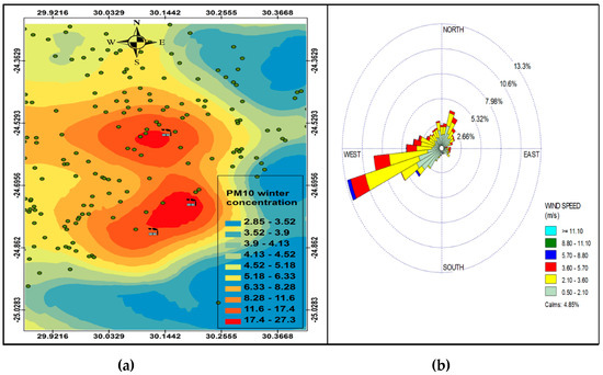 Figure 6a,b). These winds are responsible for the distribution of pollutants in a north-easterly direction in the south of the study area. The winds are then channeled in a north-westerly direction toward the north of the study area by following the valley axis. The winter season (