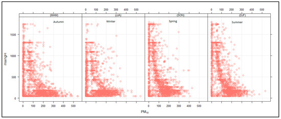 10 concentrations observed when humidity was low, though this was not as prevalent compared to when humidity was high, as was the case in other seasons. Therefore, humidity conditions positively affected the PM
