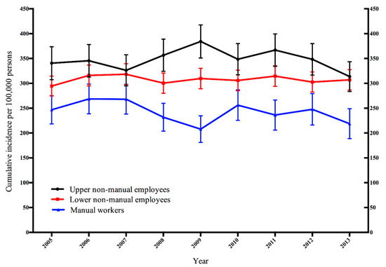 Figure 1 presents the age-adjusted annual cumulative incidence of sickness absence due to breast cancer. The cumulative incidence was highest among upper non-manual employees and lowest among manual workers with significant differences between those two study groups throughout the study period, except in year 2007 (Figure 1). The annual cumulative incidence ranged from 314 (95% CI 284–344) to 384 (95% CI 351–418) per 100,000 persons among upper non-manual employees and from 208 (95% CI 181–235) to 268 (95% CI 238–298) per 100,000 persons among manual workers. With regard to lower non-manuals, the age-adjusted annual cumulative incidence tended to be in between the latter two groups with the cumulative incidence ranging from 295 (95% CI 274–315) to 318 (95% CI 297–339) per 100,000 persons. Lower non-manual employees’ confidence intervals overlapped with either upper non-manuals or manual workers throughout the study with the exception of years 2008 and 2009. The cumulative incidence remained broadly stable in all occupational classes during the study period with the exception of 2009. In 2009, a slight increase took place among upper non-manual employees, whereas the cumulative incidence declined among manual workers. However, the occupational class differences in the cumulative incidence of sickness absence due to breast cancer remained broadly stable throughout the study period.