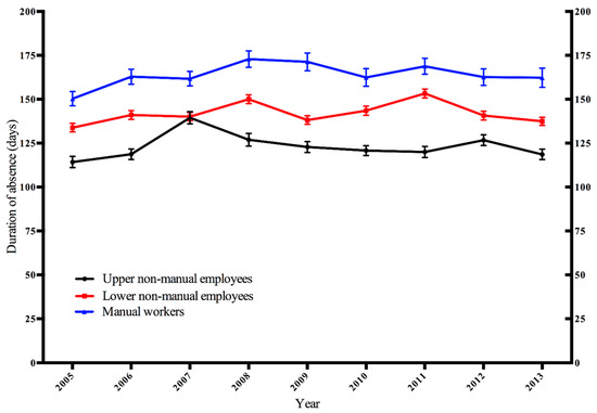 Figure 2 presents the age-adjusted duration of sickness absence due to breast cancer by occupational class annually from 2005 to 2013. Manual workers had the longest duration of absence throughout the study period, ranging from 150 days (95% CI 149–152 days) to 173 days (95% CI 171–175 days). Upper non-manual employees’ duration of absence varied between 114 days (95% CI 113–116 days) and 140 days (95% CI 138–141 days). Duration of absence among lower non-manual employees was intermediate between upper non-manual employees and manual workers with the duration ranging from 134 days (95% CI 133–135 days) to 153 days (95% CI 152–154). Hierarchical occupational class differences in the duration of absence due to breast cancer remained significant throughout the study period with the exception of the year 2007, when the duration of absence was similar among upper and lower non-manual employees.