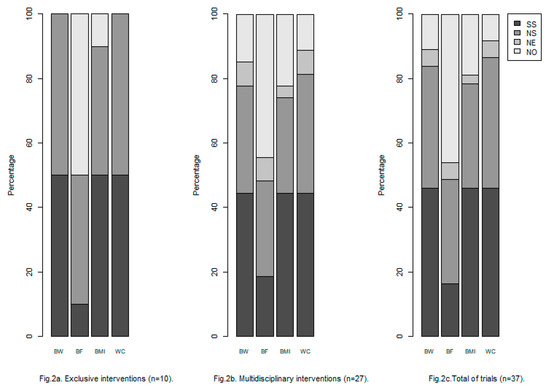 - Characteristics of clinical trials: authors, year of publication, type of randomized clinical trial, duration of intervention, instrument of analysis of body composition, type of intervention used (exclusive or multidisciplinary) and body composition variation (measured with different anthropometric parameters and units of measurement).