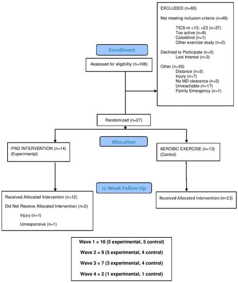 Middle-aged adults between 45 and 64 years of age with scores below 23 on the modified Telephone-Interview Cognitive Survey (TICS-m) were recruited between August 2014 and March 2016 via digital media outlets targeting residents living within a 20-mile radius of a large college campus in central Illinois. The TICS-m assesses global cognitive function and has been shown to have high reliability and validity as a cognitive status screening tool in differentiating normal cognition from MCI and dementia []. According to the original study, Welsh reported an MCI threshold score of 27 when using the 13-item TICS-m, which has a scoring range of 0–39, with higher scores indicating better cognitive performance []. Since then, researchers have suggested the importance of controlling for education when determining a cutoff score to distinguish between normal and cognitively impaired adults. As a result, Castanho recommends <23 be used in classifying participants with and without possible cognitive impairment []. A flyer and email advertisement directed participants to an online recruitment form. Research staff screened all participants via telephone. Exclusion criteria included diagnosed neurological disorders (e.g., dementia; Parkinson’s disease), functional disabilities that would inhibit participation in aerobic exercise, being physically active most days per week (>30 min/day) for the last three months, and a TICS-m score >23. Additionally, each participant must have received documented physician’s approval prior to participation in any baseline assessments. A university ethics board approved the study and all participants provided written informed consent.
