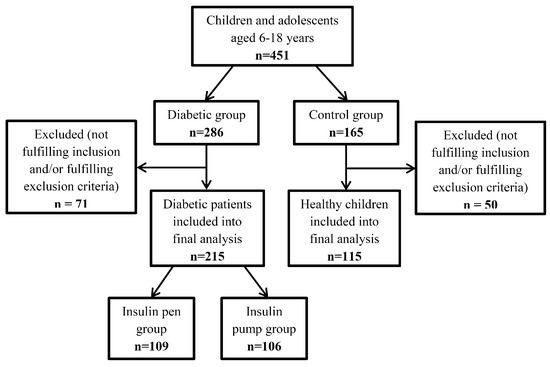 The exclusion criteria consisted of: Having type two or other type of diabetes (MODY (Maturity Onset Diabetes of the Young), diabetes associated with endocrine disorders, etc.), suffering from other metabolic disorders, having microvascular complications: Retinopathy, nephropathy, and neuropathy; or macrovascular complications: Cardiovascular disease, cerebrovascular accidents, and peripheral vascular disease, or having any other medical conditions during the study. Other contraindications were related to the timing of the study, such as extremely bad weather, holidays or the summer break, when the children’s physical activity could significantly differ from regular daily routines [16]. After a short interview when returning the accelerometer, the children and adolescents who failed to meet the requirements of the study were excluded. The most common reasons for exclusion were too short time of wearing the accelerometer because of a failure to follow instructions or the child’s illness during the examination period. Finally, 215 children and adolescents with T1D and 115 healthy comparators were included in the analysis (Figure 1).