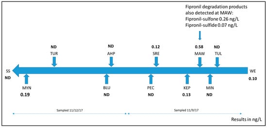 - Sadaria, A.M.; Sutton, R.; Moran, K.D.; Teerlink, J.; Brown, J.V.; Halden, R.U. Passage of fiproles and imidacloprid from urban pest control uses through wastewater treatment plants in Northern California. Environ. Toxicol. Chem. 2017, 36, 1473–1482. [Google Scholar] [CrossRef] [PubMed]