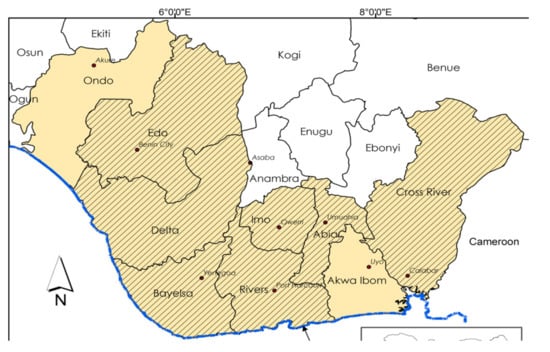 This study was conducted in Cross River State—an important State in Nigeria’s rainforest and coastal region. The last census held in Nigeria put the population of Cross River State at 4,219,244 persons []. About 73.3 per cent of households in the State depends on fuelwood as their primary cooking energy source []. Cross River and the other Niger Delta States record high indoor air pollution (IAP) level from inefficient, traditional stoves [,]. Figure 1 is the map of the Niger Delta area. The dependence on fuelwood for cooking is higher in poorer and rural areas of the State, and Cross River is one of the poor States in Nigeria, with a poverty rate of 60.4 per cent [,]. The report of the Nigerian Infrastructure Advisory Facility indicated that about 10,000 improved cook-stoves were in use in some rural communities in Cross River State [].
