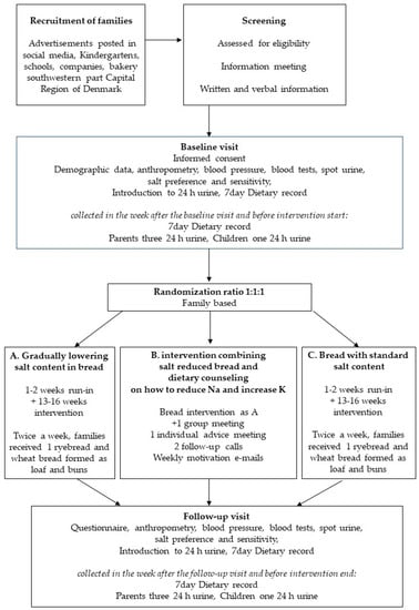 The reformulation intervention strategy makes it possible to investigate the effect of salt reduction exclusively in a single-blinded design, without changing other dietary factors. Thus, the conclusions on salt reduction will be strong and transferable to real life. Furthermore, targeting families rather than individuals improves implementation, as the setting reflects the life situation that salt is consumed in, which is essential to achieve dietary goals [].