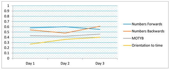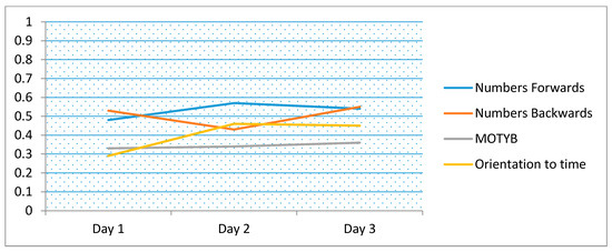 The trained nurses and independent rater examined patients over three to five days. Data sets were analysed and categorised into daily results, (see Table 2). IRR for LM was excellent, increasing from r = 0.87 on day 1 (n = 41 patients) to r = 0.97 by day 4 (n = 13 patients), a statistically significant difference, p < 0.0001. Linear mixed model regression (r = 0.93, p < 0.001) and canonical correlation (days 1–3) confirmed overall excellent IRR (r = 0.92, p < 0.001). Excluding those aged <50 years, did not alter the reliability, with the IRR increasing from r = 0.84 to r = 0.98 between day 1 and day 4. Using variance components analysis, we found that most variation between scores was due to patient factors; we observed that the largest day-to-day variability was for orientation to time (33.3%) and numbers forwards (17.7%), while the lowest was for MOTYB (4.2%) and LM (9%). We found statistically significant learning effect for numbers forwards and numbers backwards, with scores increasing (improving) significantly in the first three days, indicating learning effects (see Table 2).