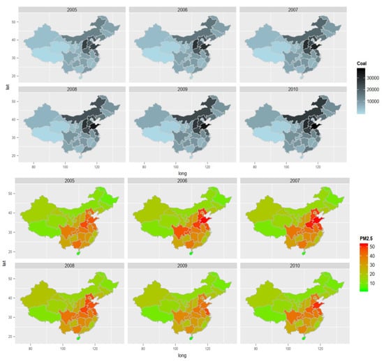 Using the ggplot2 package in R-studio, we map the annual coal consumption and population-weighted exposure to concentration data to provide a visualization of spatial distribution and temporal changes for a 5-year time trend. In Figure 1, we can partially observe the correlation between consumption of coal and fine particle pollution through the similarities in the intensity of the color mapped.