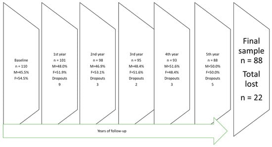 In 2009, a cohort study of seven-year-old children from a public (state-funded) school in southern Mexico City was initiated. The school was situated in a medium-income area. A total of 135 children were registered at the surveyed school. Before taking any measurements, written informed consent was obtained from the parents, and 110 children (53 boys and 57 girls) participated in the study. No data were collected from the 25 children whose parents failed to provide consent for participation. After a five-year follow-up period, 88 children (44 boys and 44 girls) remained in the study, with a 20% dropout rate. Figure 1 depicts the yearly dropout rate. Shifting residence or changes in the parent’s workplace were the main reasons for changing schools or dropping out of the cohort. No statistically significant difference was observed in the baseline dental caries index between the children who remained in the cohort (n = 88) and those who dropped out (n = 22), (p > 0.05). Only children with complete data for each annual dental evaluation were included in this study.