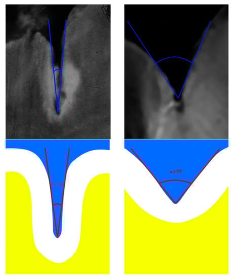 Shallow and deep fissures. Less than 70° “V angle” indicates deep fissure and a wider than 70° “V angle” a shallow fissure. [14].