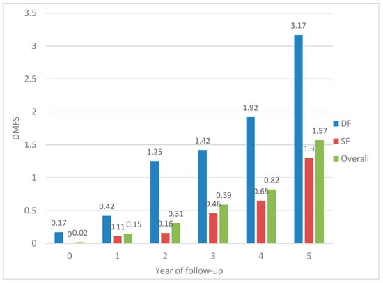 Baseline and annual mean DMFS index: Overall and based on fissure depth. DMFS = decayed, missing, and filled permanent surfaces; DF = deep fissure; SF = shallow fissure.