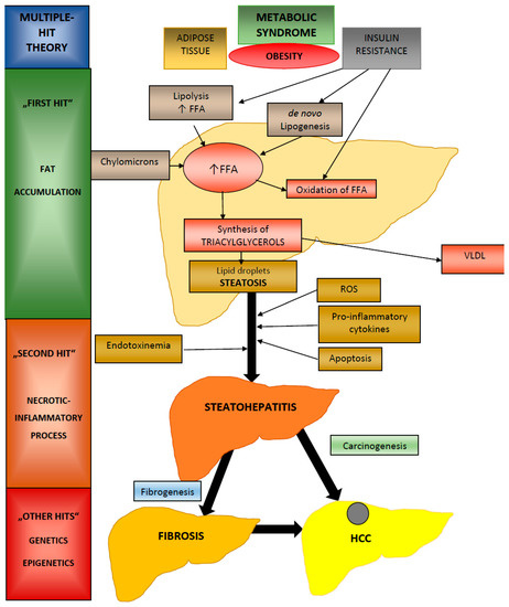 Pathogenesis of nonalcoholic fatty liver disease (NAFLD). Legend: FFA—free fatty acids, VLDL—very low density lipoproteins, ROS—reactive oxygen species, HCC—hepatocellular carcinoma.