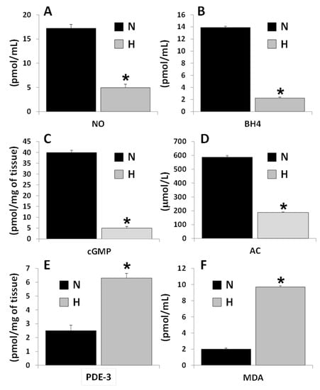 Comparison of the levels of nitric oxide (NO) (A), tetrahydrobiopterin (BH4) (B), total antioxidant capacity (TAC) (D), malondialdehyde (MDA) (F), in the sera and cyclic guanosin monophosphate (cGMP) (C), phosphodiesterase-3 (PDE-3) (E) in the ventricular tissue of normotensive (N) and hypertensive (H) rats. Values represent the mean ± standard deviation of n = 6, * p ≤ 0.05, by Student’s t-test.