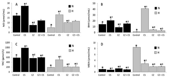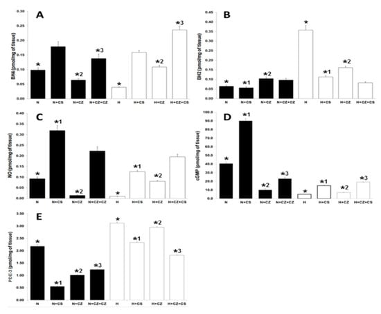 BH4 levels increased after CS administration in both N as in H rats; particularly in the last ones, where the increase was more significant. CZ and CS administered alone or in combination rose BH4 levels (Figure 2B).