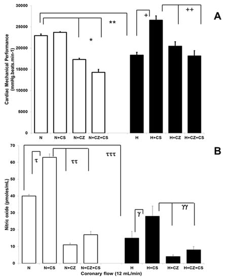 Figure 3A shows the CMP of isolated hearts of N and H rats, with the different treatments. CS did not alter the CMP of normotensive hearts but CZ alone and in combination with CS produced a significant decrease in CMP. In H hearts, CS produced an improvement of CMP which was diminished by CZ and CZ plus CS treatments. When we compared N vs. H, CMP was diminished by 25% in H hearts.