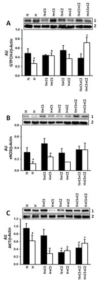 There were differences in the eNOS expression when comparing N against H rats. However, there were no significant differences in eNOS expression by the action of CS or CZ in the hearts of N rat. In H hearts the drugs (CS and CZ) stimulated eNOS and GTPCH-1 expression preventing the development of hypertension.