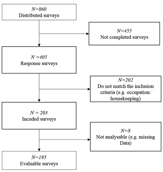 In total, 405 of all 860 distributed questionnaires of the health promotion projects were completed, which is 47%; 202 were excluded as they did not match the inclusion criteria. Eight could not be evaluated due to missing data (cf. Figure 1). Thus, there were 195 surveys included in the present data analysis.