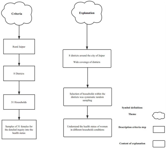 Using simple random sampling, women from 31 households in 8 districts were selected for participation (women using biofuels, 15 and older and responsible for the collection of wood and indoor cooking) across Jaipur (Figure 2). The inclusion criteria included (a) households who used wood as the cooking fuel (b) respondents were women who were aged 15 or older, (c) women who were responsible for the collection of wood, and (d) women who carried out indoor cooking. See Figure 3 for the approach to sampling. The survey was conducted during July 2018. The questionnaire was designed in English and then translated into Hindi to enable respondents to better understand the content of the study. The in-county household survey was led by Malaviya National Institute of Technology which also ensured accuracy during the fieldwork and analysis of results.