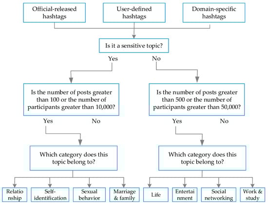 The topic data were collected by searching posts with specific hashtags in the “Topic List” module in Blued. A hashtag is a type of metadata tag that is widely used on many social networking sites and apps. With Blued, users can create and use hashtags in different languages by placing the pound sign (#) in front of a word or unspaced phrase in a non-Chinese post (e.g., #love) or by placing the pound sign both before and after words in a Chinese post (e.g., #爱自己#). Figure 1 shows the flow of topic collection, filtering, and classification used in this study. We divided hashtags into official-released, user-defined, and domain-specific hashtags. For official-released hashtags, we collected Chinese and English hashtags displayed in the “discovery” interface in Blued and hashtags released by official accounts. For user-defined hashtags, we first collected the 800 most commonly used words in Chinese. Then, we collected the 500 most popular hashtags on Instagram from a website that lists the most popular hashtags on various social networks (Top-Hashtags.com). For domain-specific hashtags, we collected sensitive topics by searching sensitive words related to gay men using the topic search interface in the app, based on our prior knowledge. Then, we used these words and unspaced phrases with the topic search interface on Blued and recorded the hashtags with a large amount of discussion or participation. After the hashtags were identified, we collected all the posts containing them. Non-English hashtags were not considered because trying to find keywords to use to search in 97 languages was not feasible. Up to March 2019, a total of 1186 topics were collected, including 551 Chinese topics and 635 English topics.