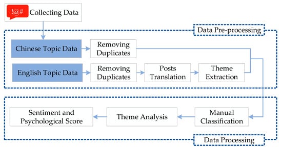 As most Chinese posts included only one hashtag, we classified them manually based on the subject of the hashtag. For the English topic data, we translated all non-English posts to English and used a semi-automatic method to extract themes from the posts. Then, we used psycholinguistic programs to calculate the total number of words each theme used that fell into each affection category and classified the affections expressed in each post. Figure 2 shows the analysis process for the topic data. For voting items, we classified them and identified the main points from the text manually.