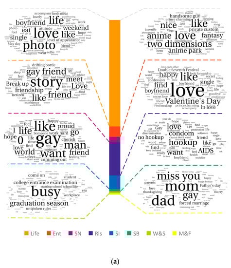 Our first research focus was theme extraction from all the posts. We divided the posts into eight categories, four of which included sensitive topics. More than 60% of the posts were related to life, especially in the English topics, followed by topics related to relationships and social networking. In fact, nearly one-fifth of the Chinese posts were related to relationships. The results reflect the social needs of users, who hope to extend the connection between each other by sharing details of their daily lives, which is very important for gay men, who cannot expose their sexual orientation on ordinary social platforms. Based on the content of the posts, it is clear that gay men are very concerned about their own appearance, body shape, and clothing. In the Chinese life topic, nearly half of the hashtags were related to selfies. When making friends, gays focus more attention on the other person’s face and body shape, whereas there is little mention of the other person’s conduct. Although face and body shape are also important in heterosexual interactions, it seems to be a greater focus in the gay community []. Related studies have shown that more gay men than heterosexual men feel pressure to be in good physical shape []. This leads to a gym culture among gay men. However, the over-emphasis of external appearance and body size within the gay community weakens the role of other factors in making friends, which may lead to unhealthy standards of spouse selection and may cause those who do not have the ideal appearance and body shape to feel inferior. In addition, relatively few posts were related to entertainment and work and study, and the content of these topics in the Chinese and non-Chinese posts varied considerably due to differences in regional cultures.