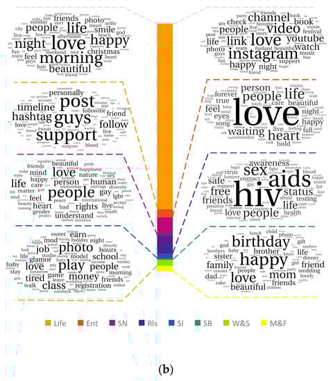 We examined the non-Chinese posts and found that, despite having attached hashtags, most of the posts were short, and single posts tended to be about a single theme. Since the standard latent dirichlet allocation (LDA) method generally does not work well with short texts, we applied a modified author-topic model named Twitter-LDA [], which assumes a single subject assignment for each post. We removed posts that only contained hashtags (more than three) and those from users with fewer than three posts. Then, we used the Twitter-LDA model to automatically extract 110 topic clusters (based on preliminary experiments) across 500 iterations from all the posts. After the noisy topics were removed, we obtained a set of 104 topic clusters, which we manually assigned to one of the eight topic categories mentioned above.