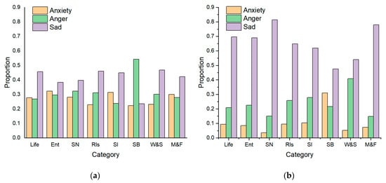 Figure 5 shows the distribution of negative emotions in the topic data. Sadness was the most common negative emotion in both the Chinese and non-Chinese posts, and the Chinese posts were more negative than the non-Chinese posts. The proportional differences between the three negative emotions in the Chinese topics were smaller than in the English topics. Except for the sexual behavior topic, the Chinese users tend to be more anxious than the non-Chinese users. Similarly, except for the self-identification and work and study topics, the Chinese posts contain more anger than the non-Chinese posts. The proportion of sadness in the non-Chinese posts was significantly higher than in the Chinese posts. Moreover, the Chinese users expressed anxiety and anger more often than the non-Chinese users. In particular, the Chinese users expressed strong anger in the sexual behavior topic while the non-Chinese users expressed more sadness in this topic.