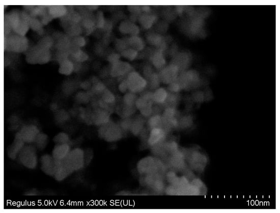 Cerium oxide NPs were purchased from the Shanghai Aladdin Bio-Chem Technology Company, LTD (Shanghai, China). The average size was 40 nm and the density was 6.71 g/mL at 25 °C. The surface morphology of the CeO2 NPs was examined with a scanning electron microscope (SEM, Hitachi Regulus SEM) (Figure 1). A 100 mg/L stock solution of CeO2 NPs was prepared through a method, in which 100 mg of CeO2 NPs were added to 1 L of Milli-Q water, followed by 1 h of ultrasonication (25 °C, 120 W, 40 kHz) [24].