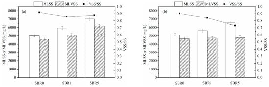 Mixed liquor suspended solids (MLSS) and mixed liquor volatile suspended solids (MLVSS) concentrations in aerobic granular sludge (AGS); (a) the first stage (the 30th day), and (b) the second stage (the 60th day).