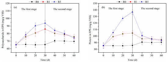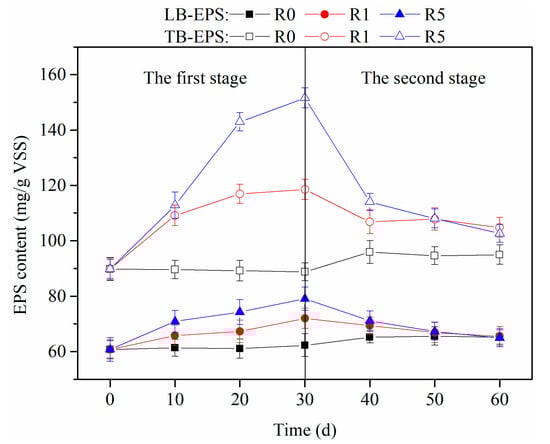 The EPS can be divided into LB-EPS and TB-EPS, which form two stratified protective barriers. The production of LB-EPS and TB-EPS were examined during the 60-day experiment to explore the characteristics of AGS after exposure to CeO2 NPs, with the results being shown in Figure 4.