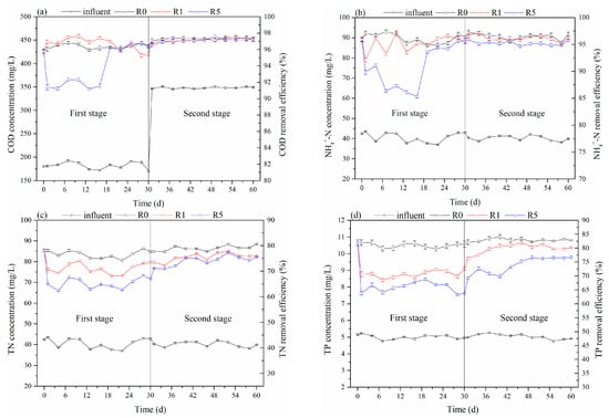 Influence of cerium oxide nanoparticles (CeO2 NPs) on the removal of chemical oxygen demand (COD) (a) and ammonia nitrogen (NH4+-N) (b) and total nitrogen (TN) (c) and total phosphorus (TP) (d) in the sequencing batch reactors (SBRs).