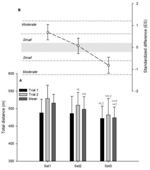Within-session variations in total distances of small-sided games. (A) Mean ± standard deviation (SD) of different sets (* small, ** moderate, *** large differences; e.g., ** 1;2: Different from sets 1 and 2 with a moderate effect). (B) Standardized difference between individual sets and mean values derived from all sets.